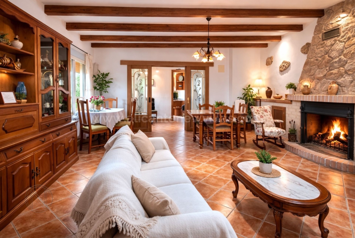 Las vigas de madera recorren la vivienda aportando personalidad y calidez, mientras los suelos rústicos y la chimenea del salón crean ese ambiente acogedor que invita a disfrutar cada momento.
